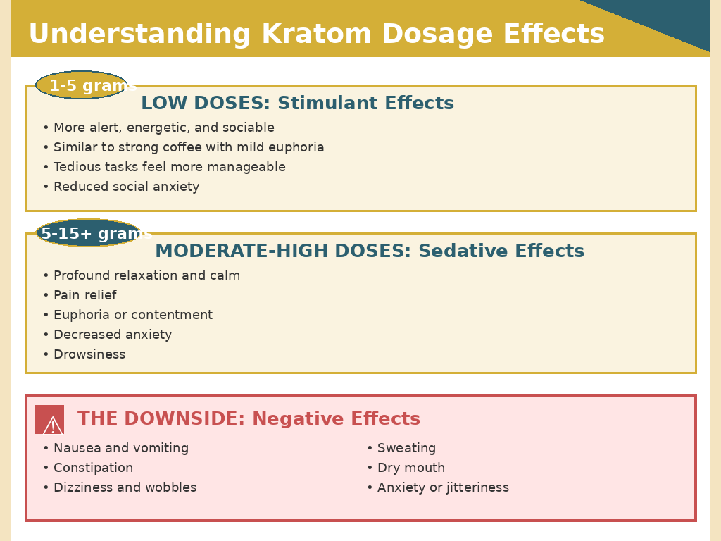 Low Doses (1-5 grams): At lower amounts, kratom produces stimulant-like effects. Users report feeling more alert, energetic, and sociable—similar to a strong cup of coffee but with a mild euphoric edge. Some describe it as making tedious tasks feel more manageable or social situations less anxiety-inducing.